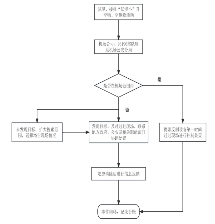 (五)完善處置程序,嚴防危害發生。各有關縣(區)、部門單位和漢中機場公司要結合機場周邊凈空環境、氣象特點等因素,充分評估“低慢小”升空物和空飄物對飛行安全的影響程度,合理制定漢中機場及周邊“低慢小”升空物和空飄物處置措施。發現或接報“低慢小”升空物和空飄物異常活動時,漢中機場公司、93190部隊和機場公安分局要第一時間趕赴現場,精準高效快速處置,必要時按照分類分級管理要求,通報有關縣(區)及職能部門共同做好處置工作。