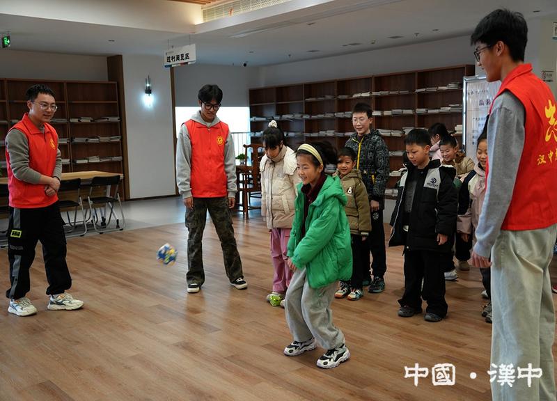 在市圖書館愛心托管班上,志愿者帶領孩子們做趣味游戲,清脆歡笑聲充盈整個場地。