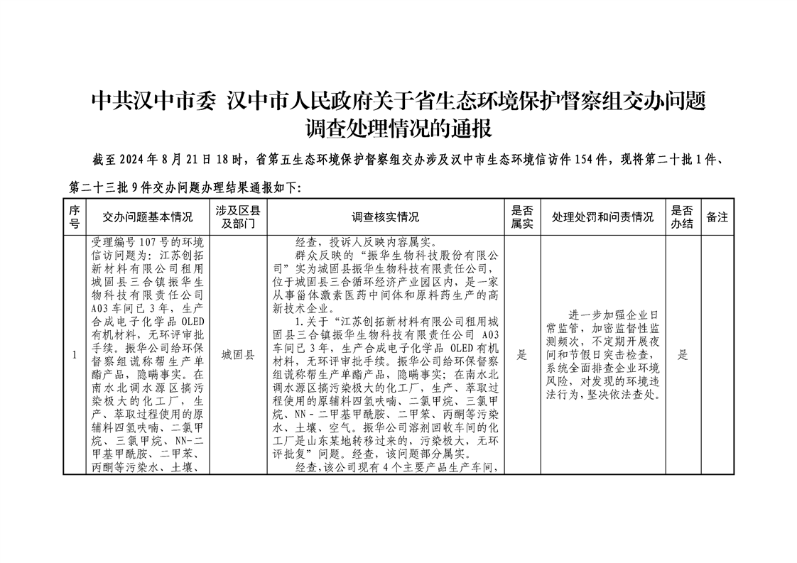 中共漢中市委 漢中市人民政府關于省生態環境保護督察組交辦問題調查處理情況的通報(第二十批1件、第二十三批9件)