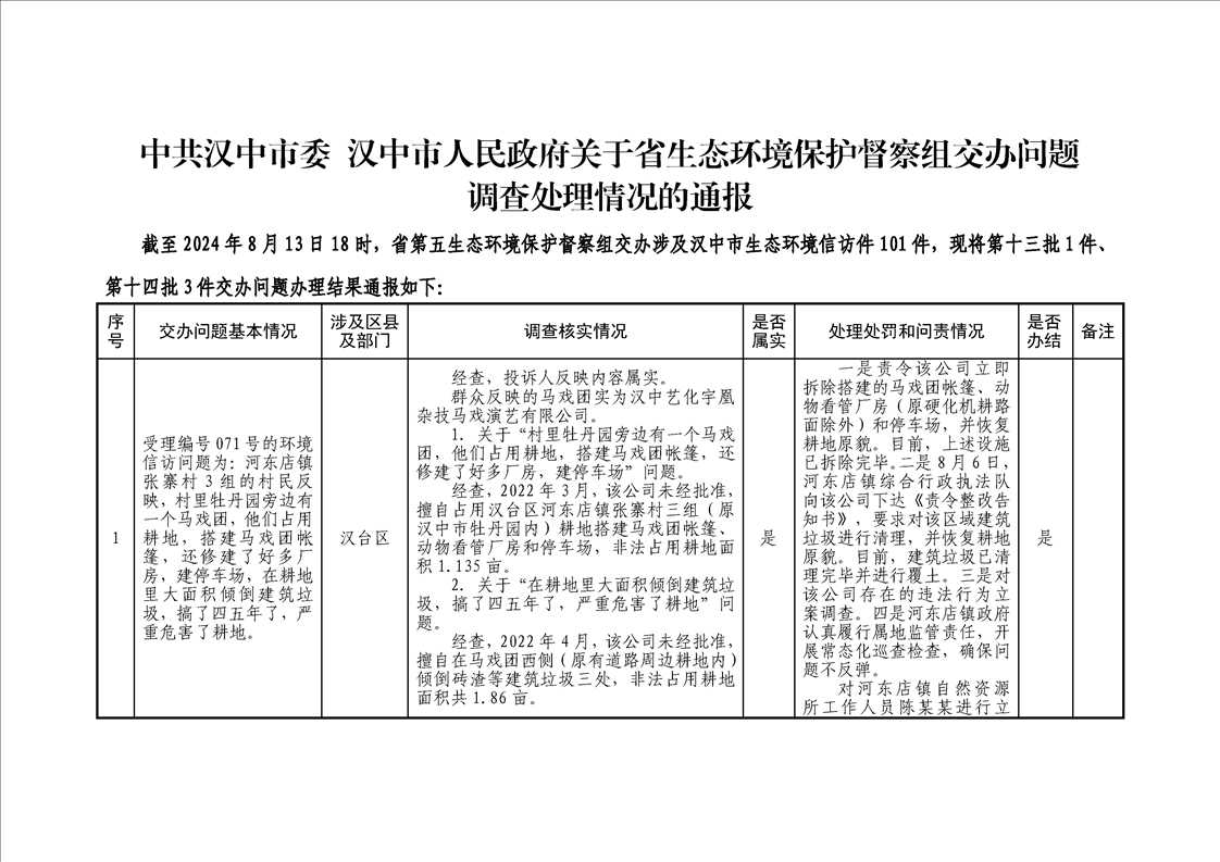 中共漢中市委 漢中市人民政府關(guān)于省生態(tài)環(huán)境保護(hù)督察組交辦問題調(diào)查處理情況的通報(bào)(第十三批1件、第十四批3件)