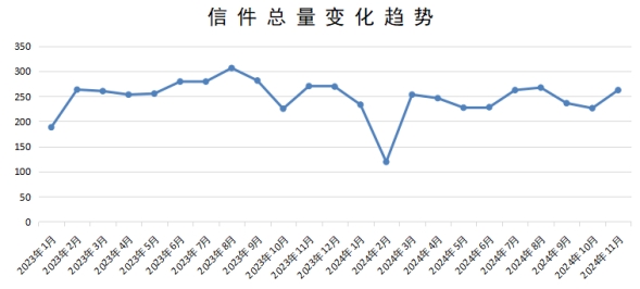 11月,“市長信箱”共收到群眾來信262件。信件總量變化趨勢如下圖所示: