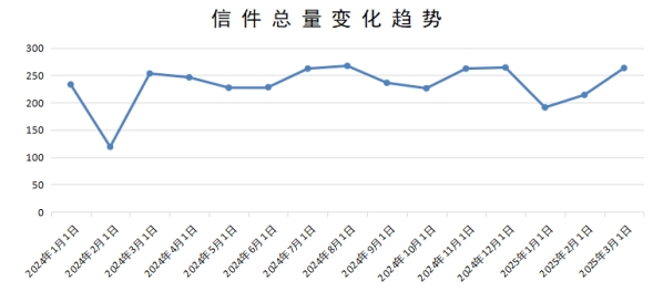 3月,“市長信箱”共收到群眾來信263件。信件總量變化趨勢如下圖所示: