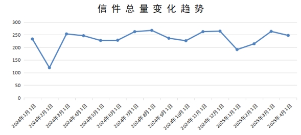 4月,“市長信箱”共收到群眾來信247件。信件總量變化趨勢如下圖所示: