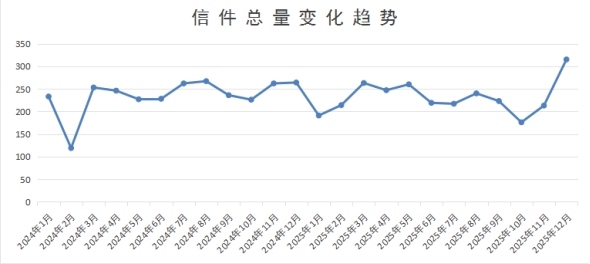 12月,“市長信箱”共收到群眾來信315件。信件總量變化趨勢如下圖所示: