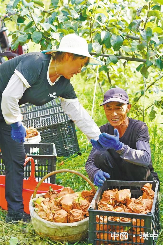 九月二十五日,村民在基地里收獲秋月梨(資料照片)