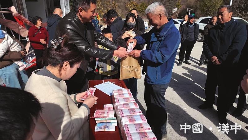 這是蔡家坡村民第3年從“能人”彭剛創辦的企業領取務工工資,加上土地流轉租金、村集體分紅等,大家領到手里的“紅票票”厚厚一沓。從2024年首次發放分紅至今,記者已是第3年見證這個秦嶺深處小山村的喜悅與變遷。