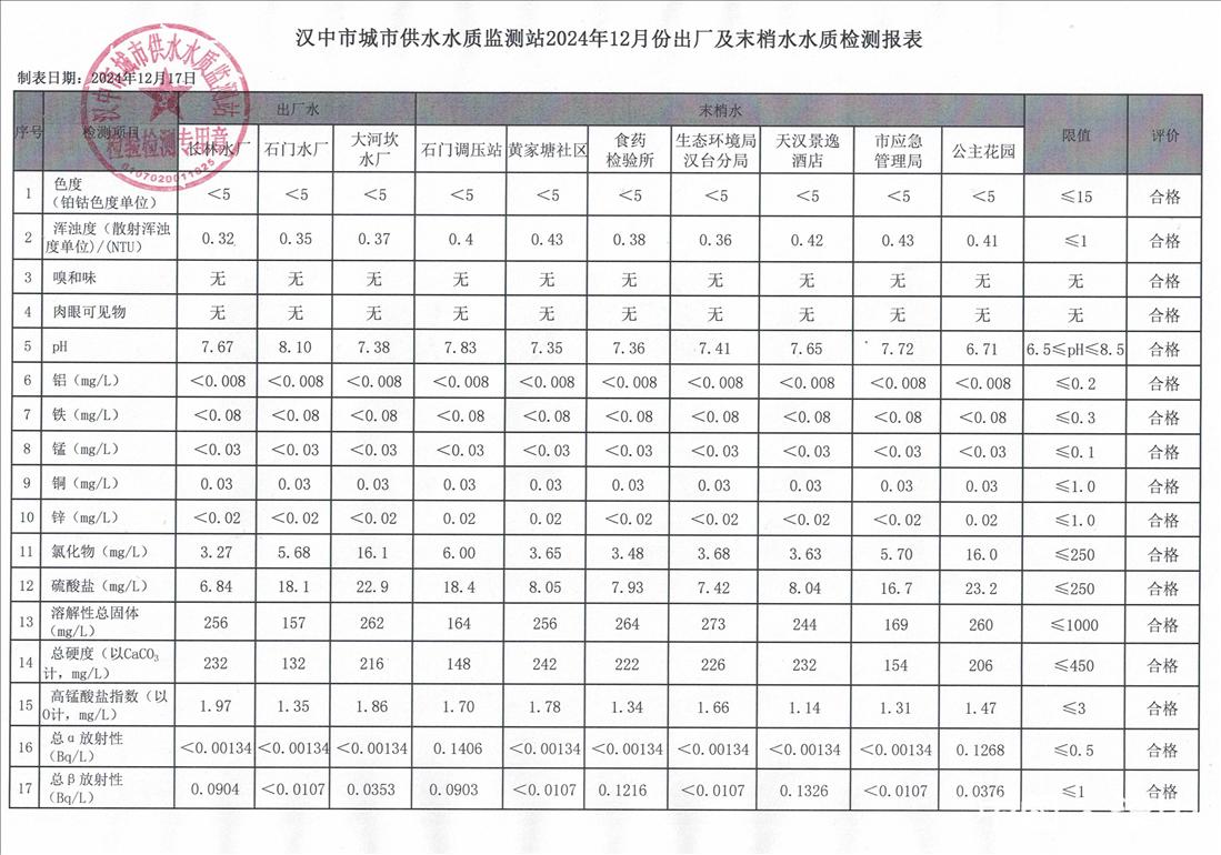 漢中市城市供水水質監測站2024年12月出廠水及末梢水檢測報表