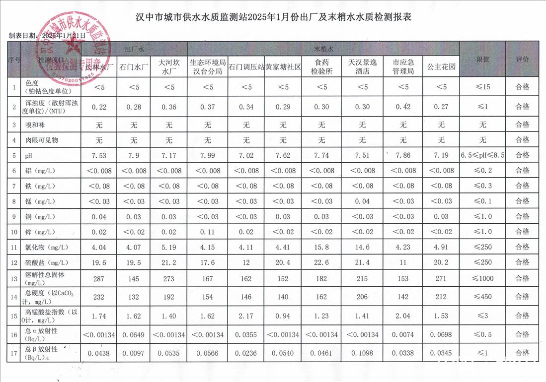 漢中市城市供水水質監測站2025年1月出廠水及末梢水檢測報表
