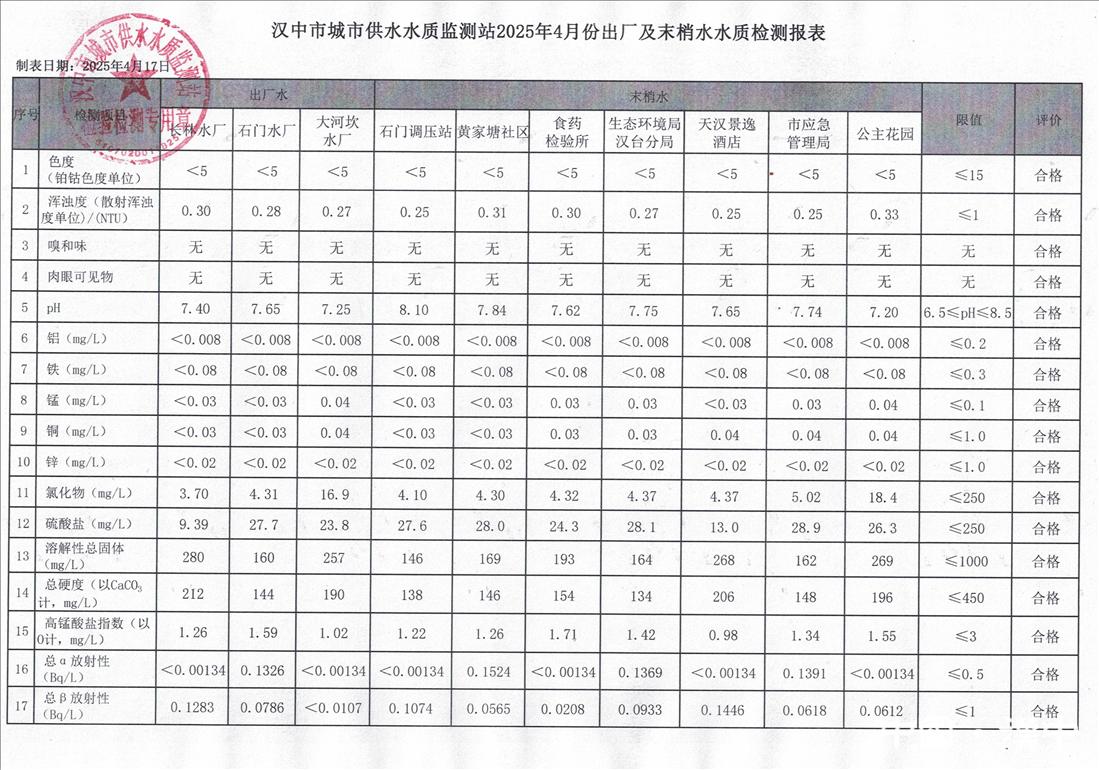 漢中市城市供水水質監測站2025年4月出廠水及末梢水檢測報表