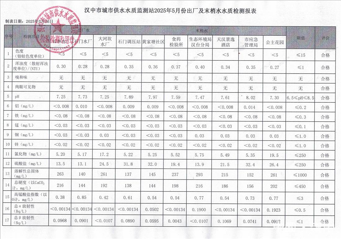 漢中市城市供水水質(zhì)監(jiān)測(cè)站2025年5月出廠水及末梢水檢測(cè)報(bào)表
