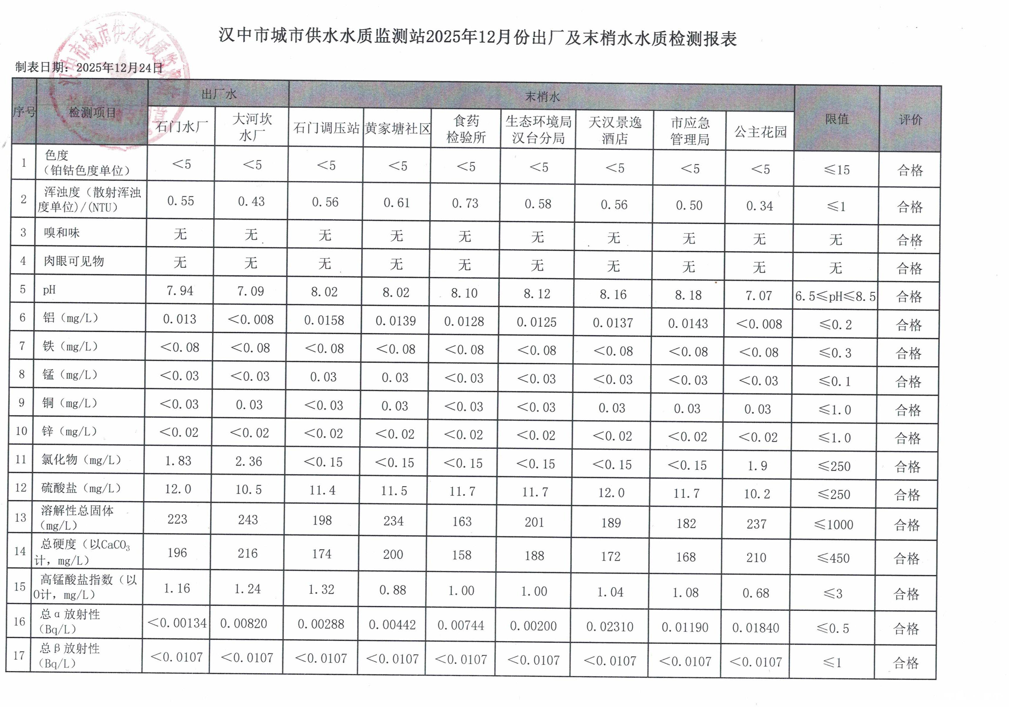 漢中市城市供水水質監測站2025年12月出廠及末梢水水質檢測報表