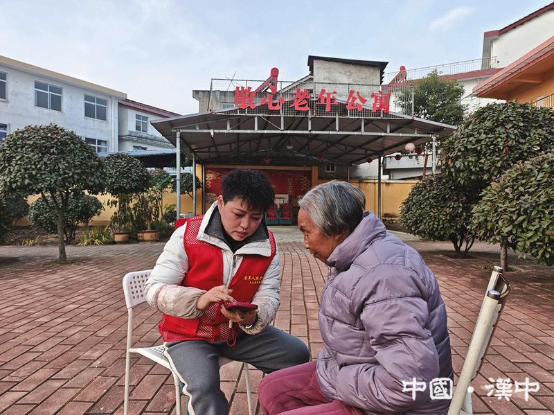 漢臺區敬心老年公寓的工作人員用手機幫張雪銀老人申領養老服務消費券。
